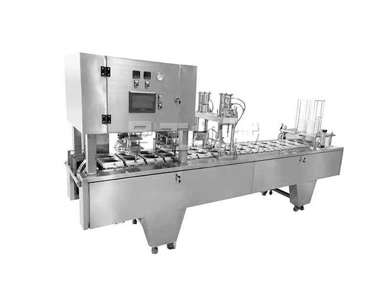本機采用合理的機械傳動,功能齊全,灌裝、封口、切邊、制品推出,廢料收卷,印碼等自動化工作,可節(jié)約人力,降低成本。本機有二次熱封裝置,料杯/碗/盒與封膜經(jīng)過前后二次熱封,封口牢固可靠。